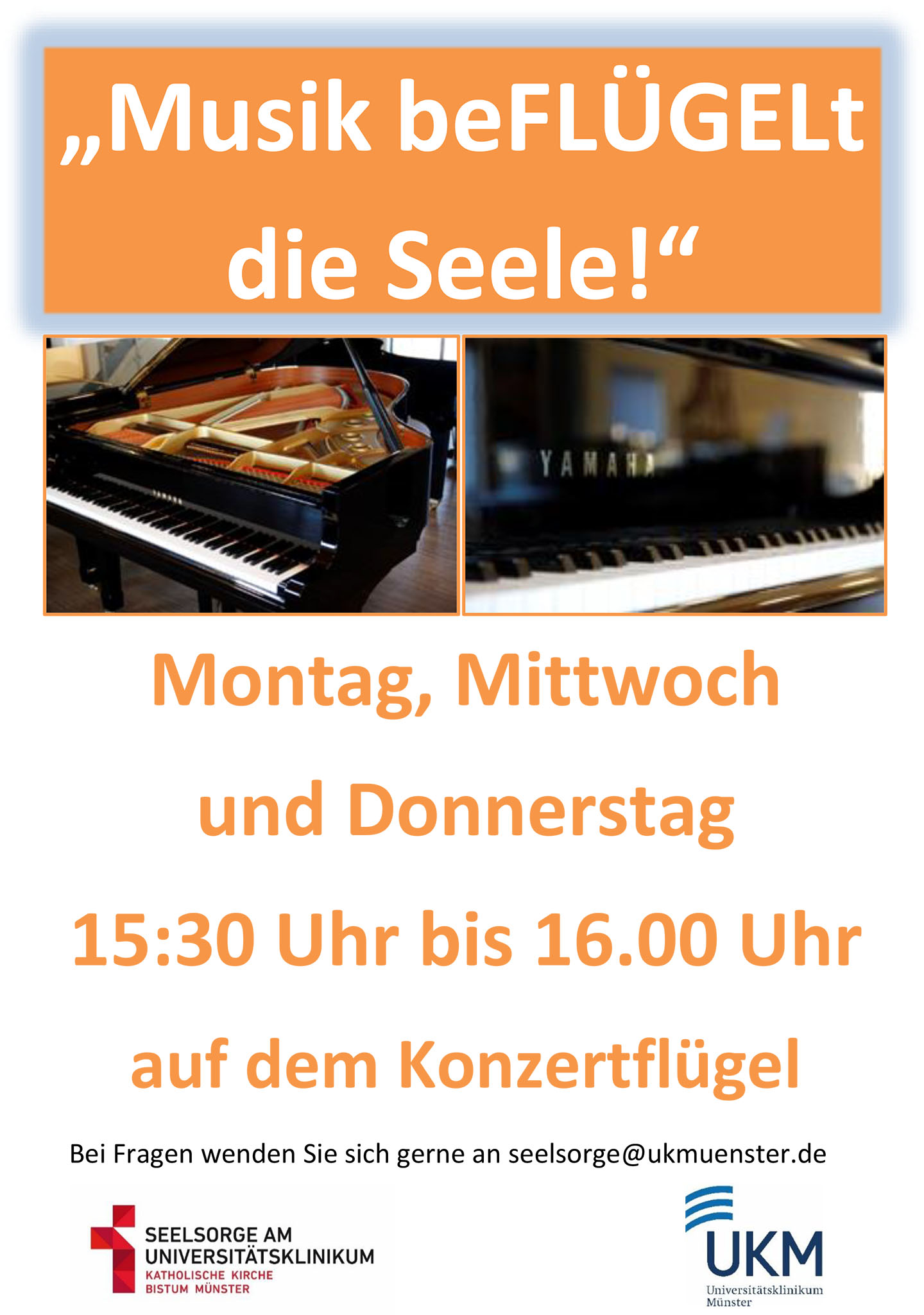 In der Seelsorge habe Musik unterschiedliche Wirkweisen, könne durchaus auch spirituelle Impulse beim Zuhörer auslösen. Nicht selten käme außerdem über das Klavierspiel ein Gespräch zustande – mit Patienten, aber auch Mitarbeitenden. So macht Prof. Dr. Claudia Rössig immer wieder die Erfahrung, dass manche Patienten den Klängen der Klaviermusik, die über mehrere Ebenen zu hören ist, zu ihrer Quelle auf Ebene 05 folgen. „Ich selbst erlebe die oft unerwartete Klaviermusik an den immer unruhigen Tagen in der Klinik als eine kleine Oase der Ruhe“, schildert die stellvertretende ärztliche Direktorin des UKM. So geht es auch einer Mitarbeiterin der psychosozialen Beratung in der Pränataldiagnostik, die ihr Büro auf dem „Flügelflur“ hat. „Ich arbeite meist mit Paaren in hochbelasteten Krisensituationen“, berichtet sie. „Und auch wenn die Musik von ihnen oft gar nicht bewusst wahrgenommen wird, habe ich den Eindruck, dass sie einen positiven Einfluss auf deren Belastungsgefühl und Stresslevel hat.“