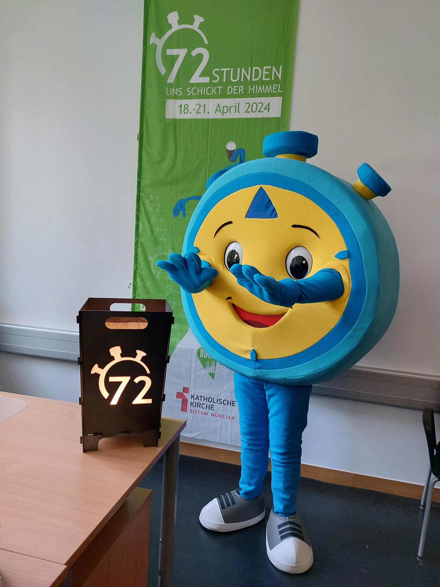 Stoppi, das Maskottchen der 72-Stunden-Aktion, wärmt sich bereits für seinen Einsatz bei der 72-Stunden-Aktion 2024 auf.