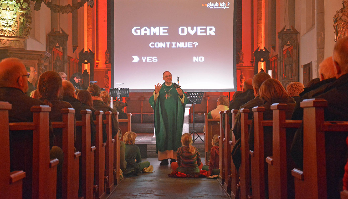 Weihbischof Lohmann griff in seiner Predigt das Motto „Game over“ auf, indem er auf das Evangelium verwies. In diesem wurde berichtet, wie die Jünger nach Jesu Tod erfolglos die Netze in einem See auswarfen, bis der auferstandene Christus – zunächst unerkannt – zu ihnen kam. Auf seine Weisung, die Netze an anderer Stelle auszuwerfen, waren sie beim nächsten Einholen prall gefüllt. „Die Jünger hatten damals alles auf eine Karte gesetzt, ihr früheres Leben für Jesus aufgegeben. Und dann endet es plötzlich am Kreuz, ,Game over‘, da ist nichts mehr“, sagte Lohmann. „Sie gehen wieder dem Alltag nach, bis Jesus sagt: ,Macht es anders, nicht, wie ihr es gewohnt seid‘, und dann machen sie eine tolle Erfahrung.“ Das gelte noch immer, denn trotz aller Widrigkeiten dürften auch die Menschen erfahren, dass alles anders werden kann, wenn Jesus ins Spiel kommt. Es gebe viele Situationen, in denen man „Game over“ sagen könne, bei Hunger, Elend, Terror und Gewalt, doch durch Jesus könne sich die Welt ändern: „Aus Tod wird Leben, aus Hass wird Liebe“, erklärte der Weihbischof.