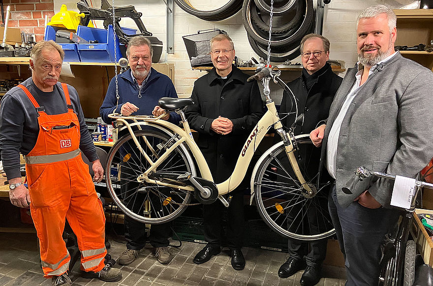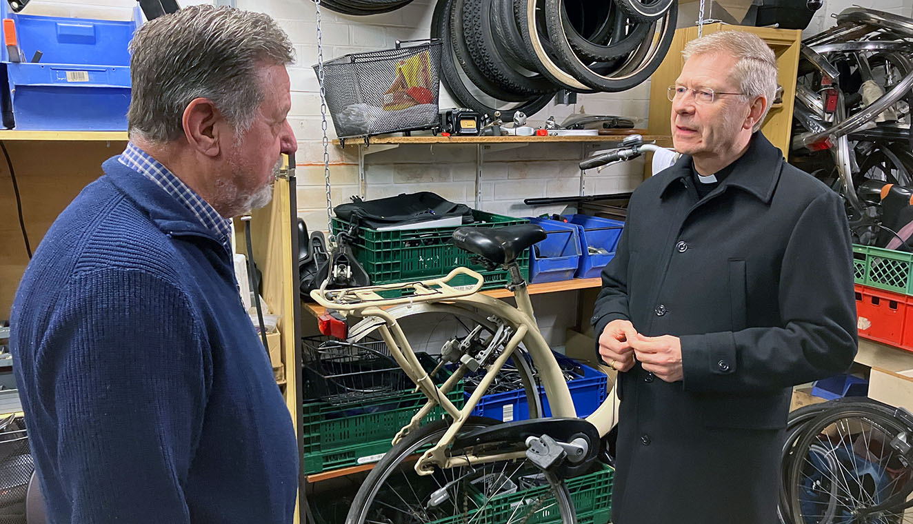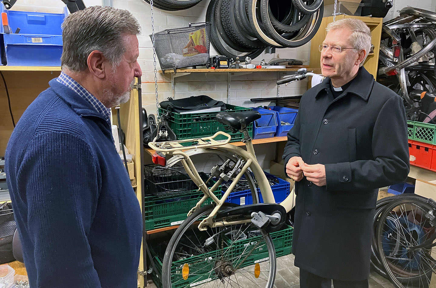 Von Karl-Heinz Lahr ließ sich Weihbischof Dr. Stefan Zekorn die Arbeitsweise in der Fahrradwerkstatt erklären.