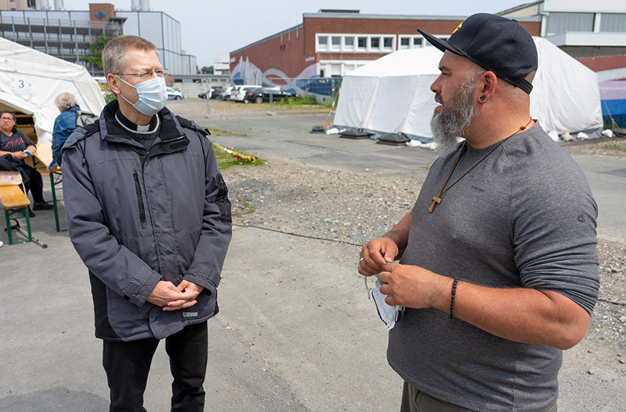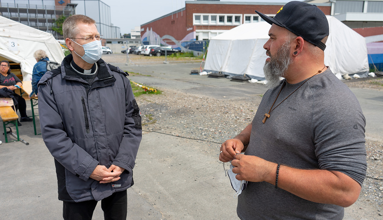 „Ich habe mir fest vorgenommen, dass der Treffpunkt ‚An der Clemenskirche‘ einer der ersten Orte sein wird, die ich besuche, wenn die Corona-Beschränkungen gelockert werden“, berichtet Weihbischof Dr. Stefan Zekorn, Regionalbischof für das Stadtdekanat Münster. Im Gespräch mit den haupt- und ehrenamtlichen Mitarbeitern informierte sich der Weihbischof über die Arbeit unter den behelfsmäßigen Bedingungen im „Pfingstlager für Wohnungslose“, wie Matthias Eichbauer die Zeltstadt schmunzelnd nennt. „Der Einsatz der Haupt- und Ehrenamtlichen ist enorm wichtig im Rahmen der Wohnungslosenhilfe“, betont Zekorn während seines Besuchs. Bereits seit seiner Zeit im Priesterseminar kennt er den Treffpunkt „An der Clemenskirche“, bei deren Gründerin und damaligen Leiterin, der Clemensschwester Evelyne, sich der spätere Weihbischof Anregungen zum Aufbau der „Teestube“ für Wohnungslose im Priesterseminar Borromaeum einholte.