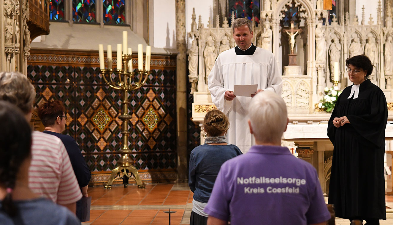 In einem Wortgottesdienst in der St.-Felizitas-Kirche in Lüdinghausen erhielten die beiden Frauen am Freitagabend (21. August) ihre Beauftragung aus den Händen von Pastoralreferent Andreas Naumann-Hinz und Pfarrerin Alexandra Hippchen. „Ab heute sind sie Vollmitglieder in unserem Team. Gute Leute können wir immer gebrauchen, und wir finden sie auch“, freute sich Hippchen. In ihrer Predigt über die Begegnung des blinden Bettlers mit Jesus in Jericho schlug sie den Bogen zur Notfallseelsorge. „Jesus fragt den Blinden: ‚Was willst du, das ich dir tue?‘ Das ist auch für unseren Dienst eine gute Frage. Wir müssen warten bis die Belasteten es uns verraten. Manchmal sagen sie es uns auch nicht“, hielt sie fest. Das müssten die Notfallseelsorgerinnen und -seelsorger akzeptieren. Demut sei in dieser Situation ein wichtiges Wort. Denn die Betroffenen stünden unvorbereitet vor den Ruinen ihres Lebens. „Was sie damit machen, ist ihre Entscheidung. Das ist nicht einfach. Es ist eine schöne, aber keine leichte Aufgabe“, betonte die Koordinatorin.