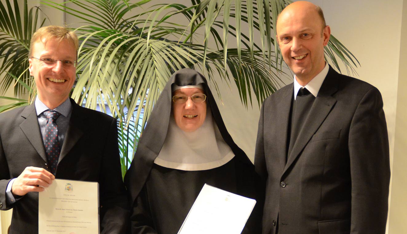 Offizialatsrätin Schwester Scholastika, die seit 1998 Benediktinerin im Kloster Burg Dinklage im niedersächsischen Bistumsteil ist, schloss an ein Geschichts- und Theologiestudium auf Lehramt vor ihrem Klostereintritt ein Studium des kanonischen Rechts – also des Kirchenrechts – an. Den entsprechenden Abschluss, das Lizentiat, erwarb sie 2004. Seit 2005 ist die 49-Jährige als Ehebandverteidigerin am Offizialat in Münster tätig. 2016 promovierte sie in katholischer Theologie in Vallendar mit einer kirchenrechtlichen Arbeit.