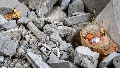 Ein Jesuskind liegt inmitten von grauem Bauschutt – geborgen in einer Schubkarre, eingehüllt in eine Pusteblume. Das Werk der Künstlerin Simone Thieringer ist eines der eindrucksvollsten in der neuen Krippenkunst-Ausstellung im Museum Relígio in Telgte.