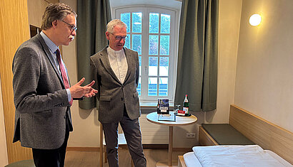 • Diözesanadministrator Antonius Hamers unterhält sich in einer Küche mit Mitarbeitenden des Hauses der Familie.