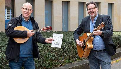 • Zwei Männer stehen an einer Amboss-Skulptur, einer hält ein Buch in die Kamera.