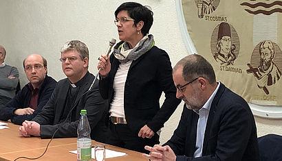 • Generalvikar Klaus Winterkamp, Tanja Schalkamp (Vorsitzende des Pfarreirates), Bischof Felix Genn, Pfarrer Martin Klüsener und Moderatorin Lena Zils sitzen an einem Tisch im Altarraum der St. Margareta-Kirche Wadersloh