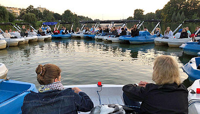Firmlinge starten in Tretbooten auf dem Aasee