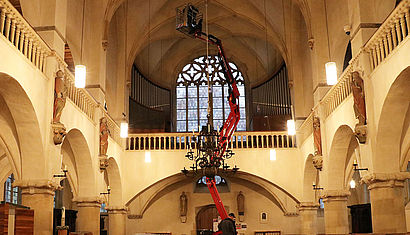 • Der Innenraum der Überwasserkirche ist in buntes Licht getaucht, rund um eine Statue stehen brennende Opferkerzen.