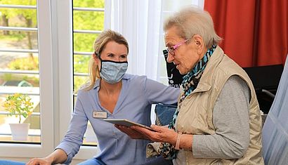 • Eine Pflegerin kniet vor einer Seniorin, die in einem Wohnzimmer auf einem Pflegebett sitzt.