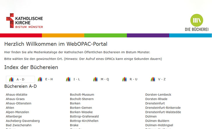 Auf dieser Seite erhalten Sie einen Überblick über die digitalen Angebote für Büchereien im Bistum Münster u.a. mit Informationen zu den Onleihen, Links zu den Anwenderforen für die Bibliotheksoftware und dem Gesamtkatalog der KÖBs im Bistum Münster.